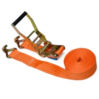 Стрічка виконана з міцного синтетичного волокна, сталева тріскачка і два гачки мають антикорозійне покриття. Максимальне навантаження 4 тони (4000 dan). Призначена для фіксації грузів при транспортуванні.