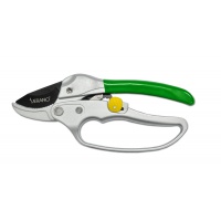 Секатор з титанового сплаву. Посилений храповий механізм діє за принципом домкрата, дозволяючи зрізати товсті гілки. Зріз прямий.