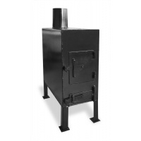 Об’єм опалювального приміщення: до 40 м3 Час роботи на одній закладці: 2-3 години Товщина листа корпусу: сталь 3 мм Вага: 26 кг Габаритні розміри (ВхШхГ): 220х450х450 мм Висота ніжок: 160 мм Діаметр димоходу: 110 мм Максимальний обсяг закладки дров: 15-20 л ККД печі буржуйки: до 75% Піч Буржуйка є зварна сталева конструкція прямокутної форми на ніжках з виходом під димохід. Стінки Печі Буржуйки виполненини з 3 мм листової сталі, в свою чергу, топка печі виробляється з високоміцної 5 мм сталі, яка витримує високу температуру. Зовнішня частина корпуса печі пофарбована фарбою чорного кольору. Термін служби печей при правильному режимі експлуатації складе не менше 10 років. Як паливо в даних Печах буржуйки можна використовувати всі доступні види твердого палива (дрова, брикети, пресовані тирсу та папір, різне сміття), крім вугілля і гуми Призначена для опалення приміщень - дачі, цехи, майстерні, битовки, теплиці, хліва, курники і т.д.