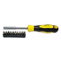 Викрутка посилена з магнітним тримачем. До комплекту входять 10 біт, виготовлених зі сталі S2, загартованої до твердості 58-62 HRC. Сильний магніт надійно утримує біти в тримачі при роботі. Зручна двокомпонентна ручка з отвором. Застосовується для робіт з різьбовими з'єднаннями.
