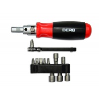 Викрутка з міцної сталі Cr-V, проходить термообробку. Зручна двокомпонентна ручка з ємністю для зберігання біт (відкривається сзаду). До набору входять тріскачка з реверсивним механізмом та 11 насадок зі сталі Cr-V: насадки-головки 5, 6, 7, 8, 9 мм, біти SL4,5, SL7; PH1, PH2; TORX T15, T20. Застосовується для робіт з різьбовими з’єднаннями.