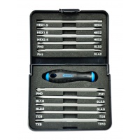 До набору входить викрутка-тримач та 10 двосторонніх насадок з міцної сталі S2 (PH0, PH1; SL1.5, SL2.5, SL3, SL4; HEX: H1.3, H1.5, H2, H2.5, H3, H4; TORX: T5, T6, T8, T10). Зручна двокомпонентна ручка невеликого розміру дозволяє працювати з дрібними деталями та виконувати точні роботи. Насадки легко заміняються та плотно фіксуються у ручці.