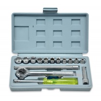 Набір головок (4-13 мм) 1/4 ", 15 предметів, пластиковий ящик. У набір входять: вороток на 1/4", подовжувач на 1/4 "- 50 мм, подовжувач на 1/4" - 145 мм, викрутка на 1/4 ". Інструменти виготовлені з вуглецевої сталі С45. Ковка та гартування. Хромове покриття. Зручний пластиковий футляр. Застосовується при виконанні автослюсарних робіт та інших робіт з різьбовими з’єднаннями.