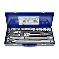 Набір головок і насадок 1/2", 26 позицій, Cr-V. Всі інструменти виготовлені з високоякісної легованої хромом і ванадієм сталі. Тип обробки поверхні - "сатин". Металевий футляр має елегантний дизайн і зручний при транспортуванні.