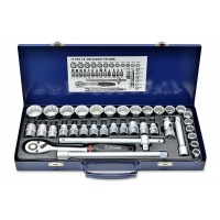 Набір головок і насадок 1/2", 36 позицій, Cr-V. Всі інструменти виготовлені з високоякісної легованої хромом і ванадієм сталі. Тип обробки поверхні - "сатин". Металевий футляр має елегантний дизайн і зручний при транспортуванні.